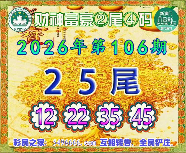 106期:【财神富豪】 🏇②尾④码🏇【25尾主:12.22.35.45】开:00准