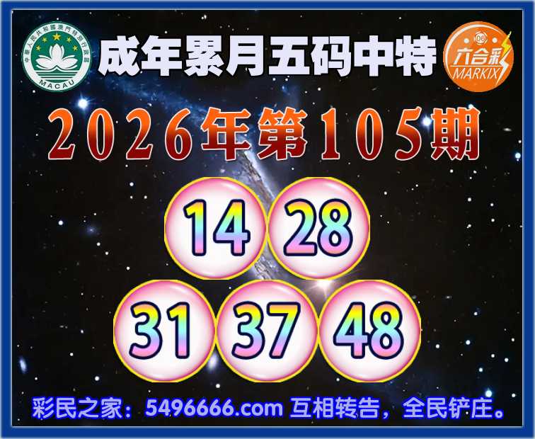 105期:【成年累月】五码中特✨【14.28.31.37.48】开:28