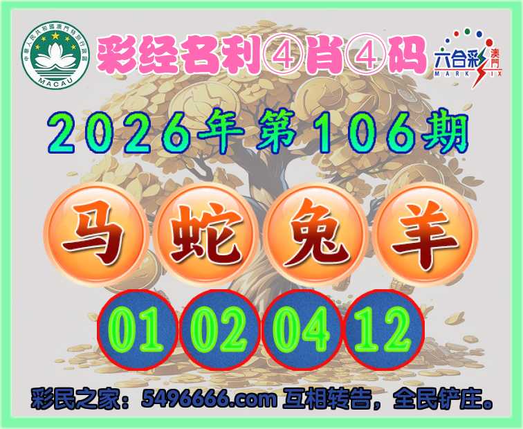 106期:《彩经名利》 🍏④肖④码🍏【马蛇兔羊】【01.02.04.12】开:00准